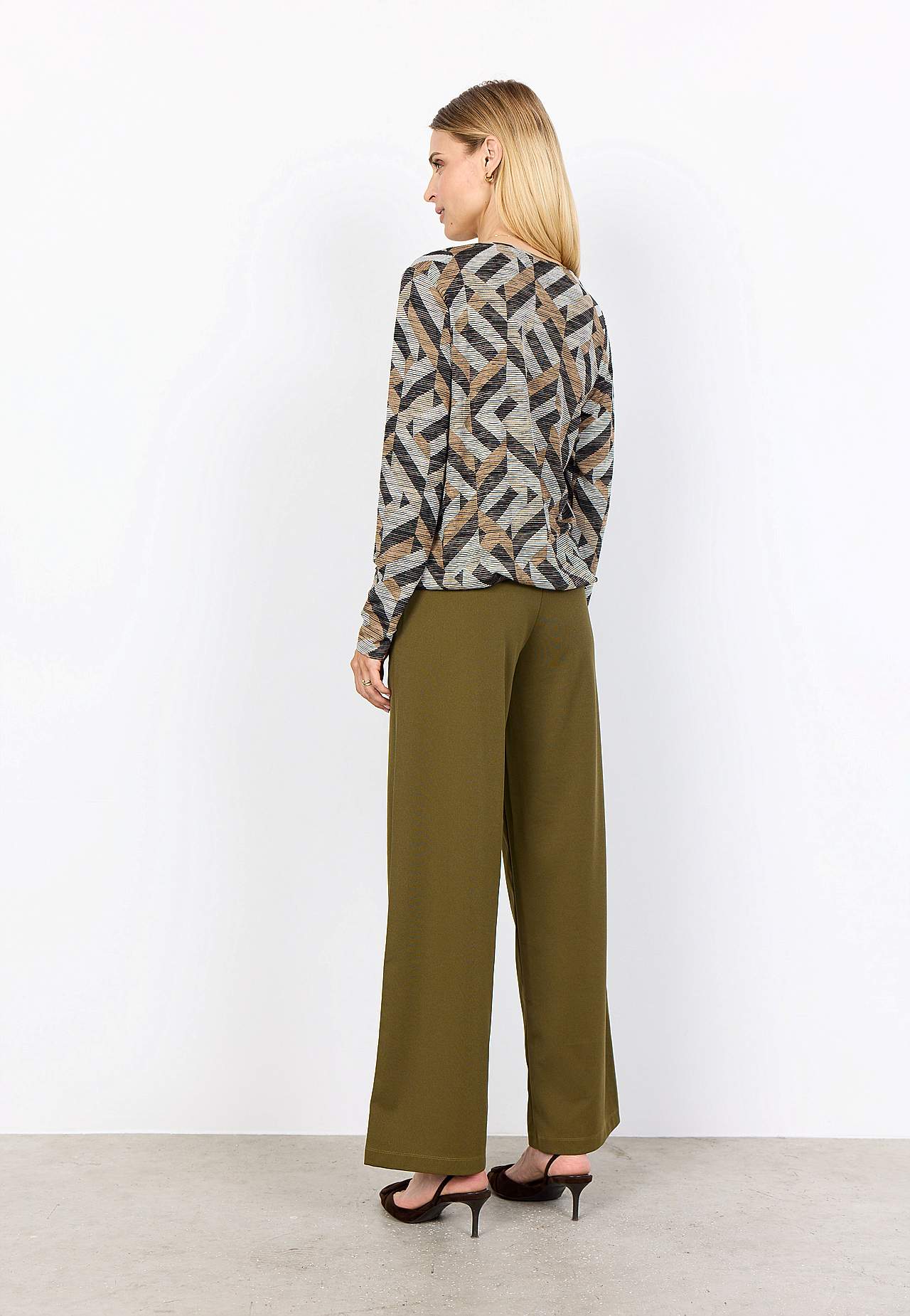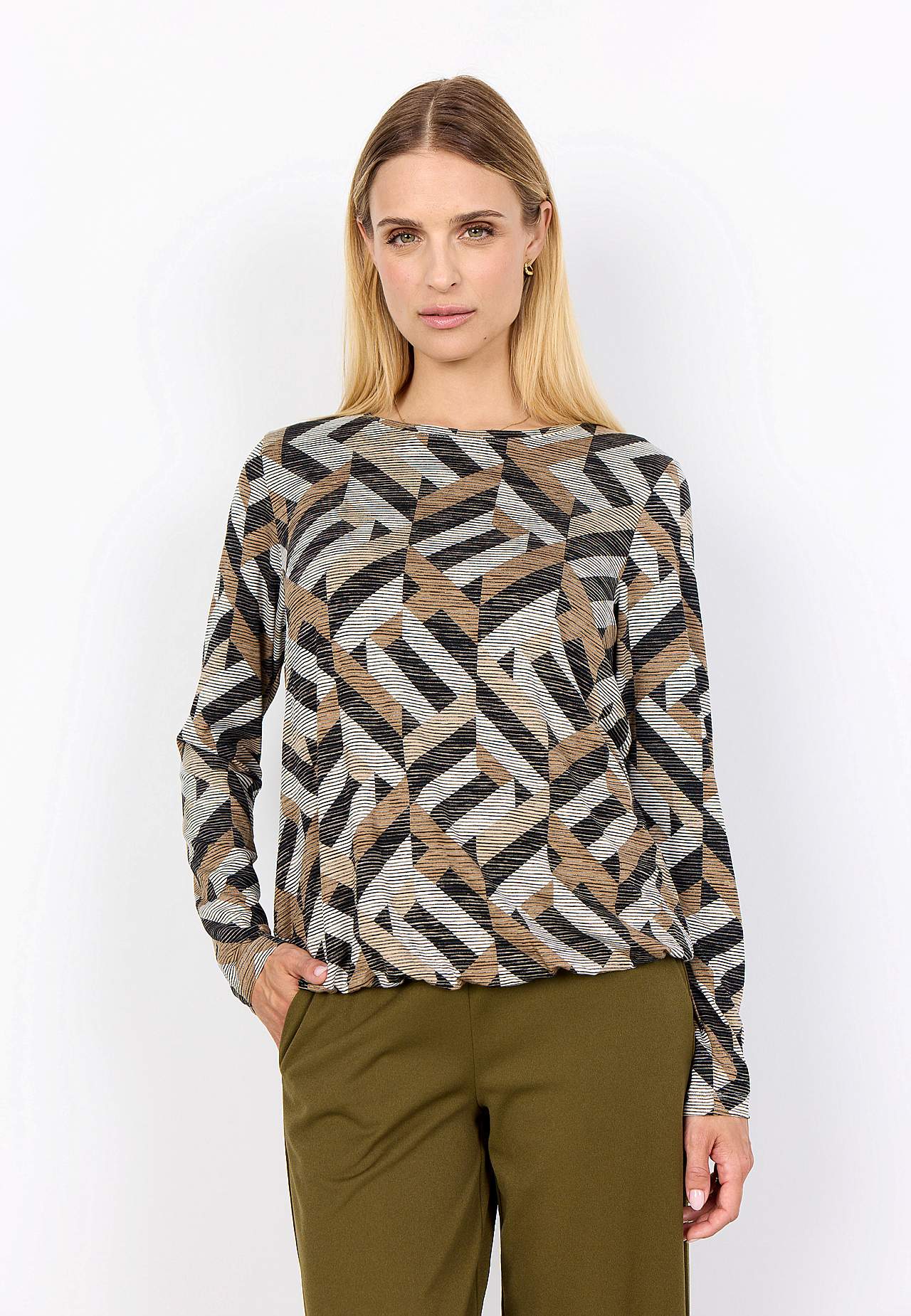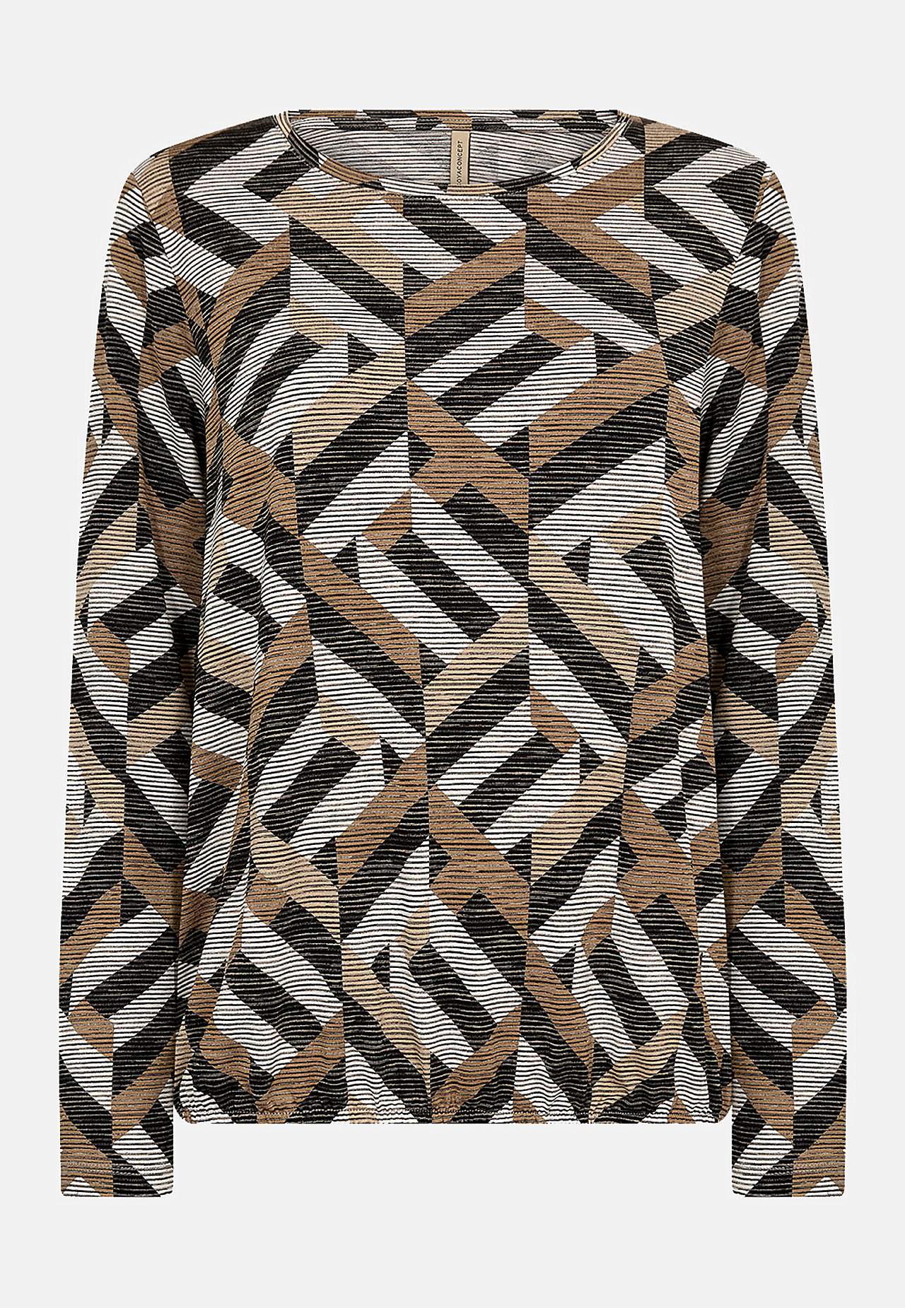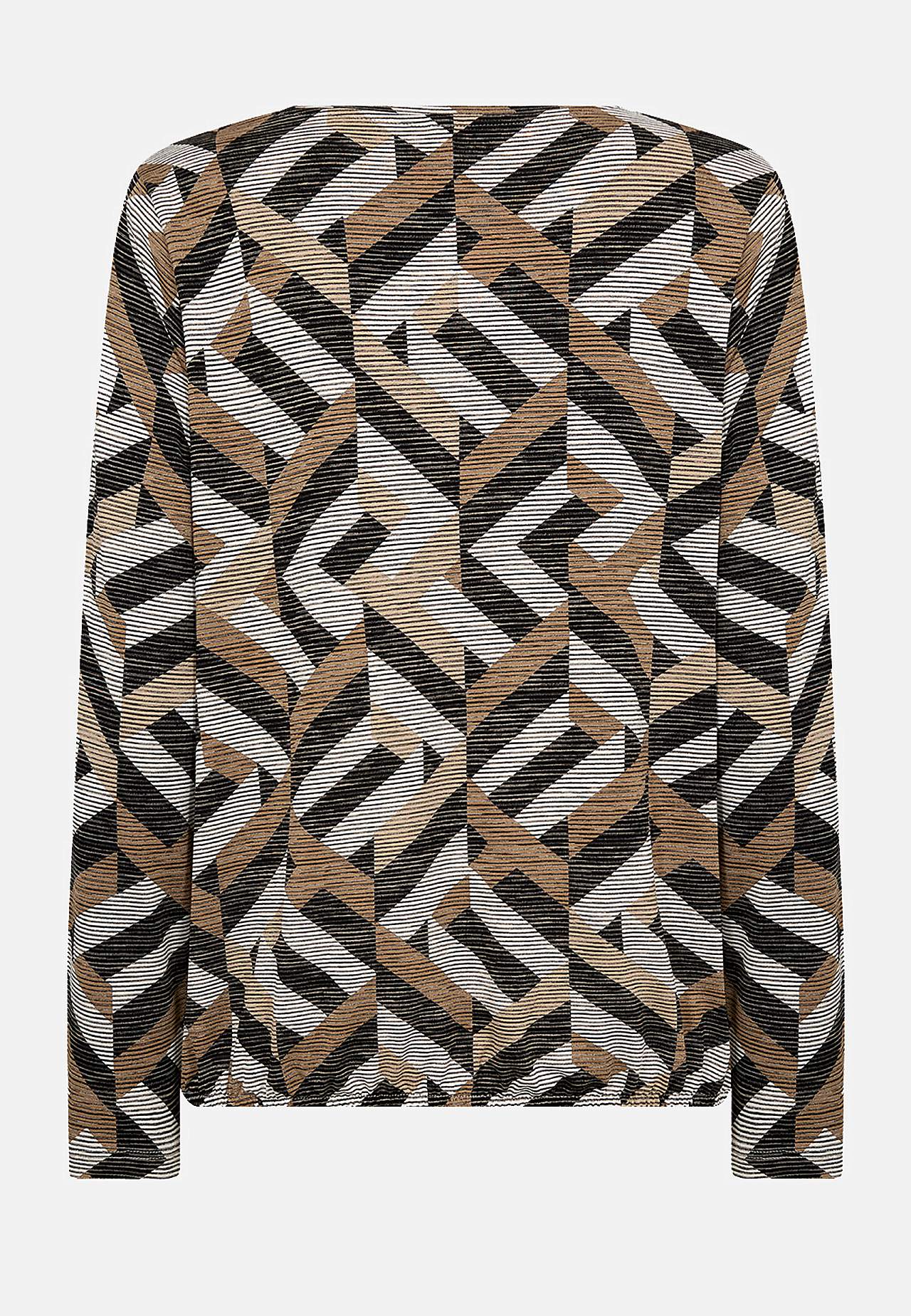 Plāns elastīga materiāla tops. Grafisks raksts zemes toņos. Taisns modelis. Apaļš kakla izgriezums. Garas piedurknes. Taisna apakšmala ar gumiju. Garums no pleciem S(38.) izmēram aptuveni 66 cm.