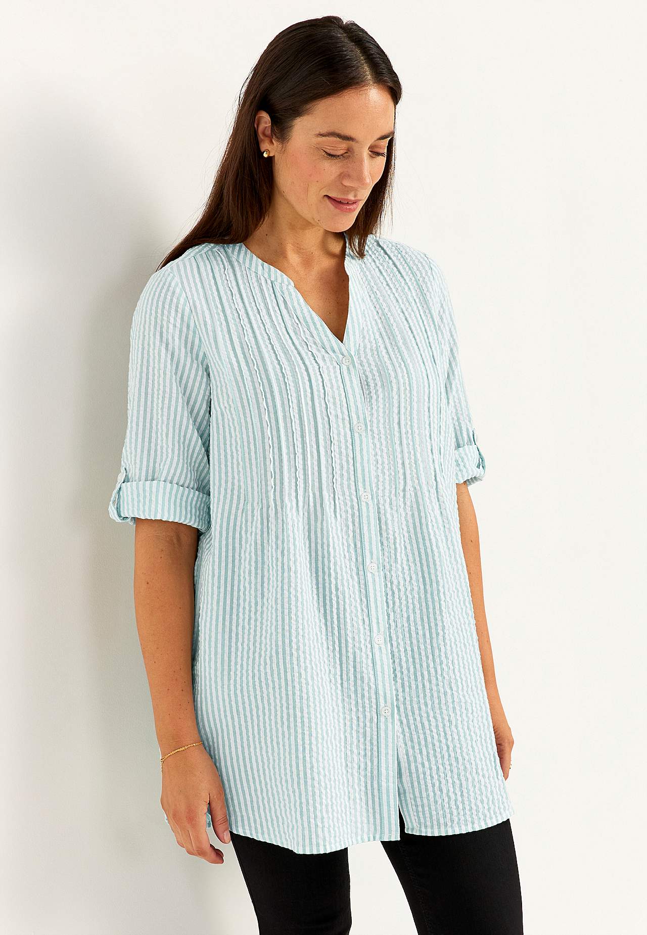 Gaisīgs garš krekls ar dekoratīvām nošuvēm. Skaists krokots materiāls. Apaļš kakla izgriezums ar V veida atvērumu. Pogu aizdare. Platas, uzlokāmas ¾ garuma piedurknes ar pogu. Sānos slēptas kabatas. Atdaļa un krokojums mugurpusē. Garums no pleca atbilstīgi izmēram apmēram 82-94 cm.