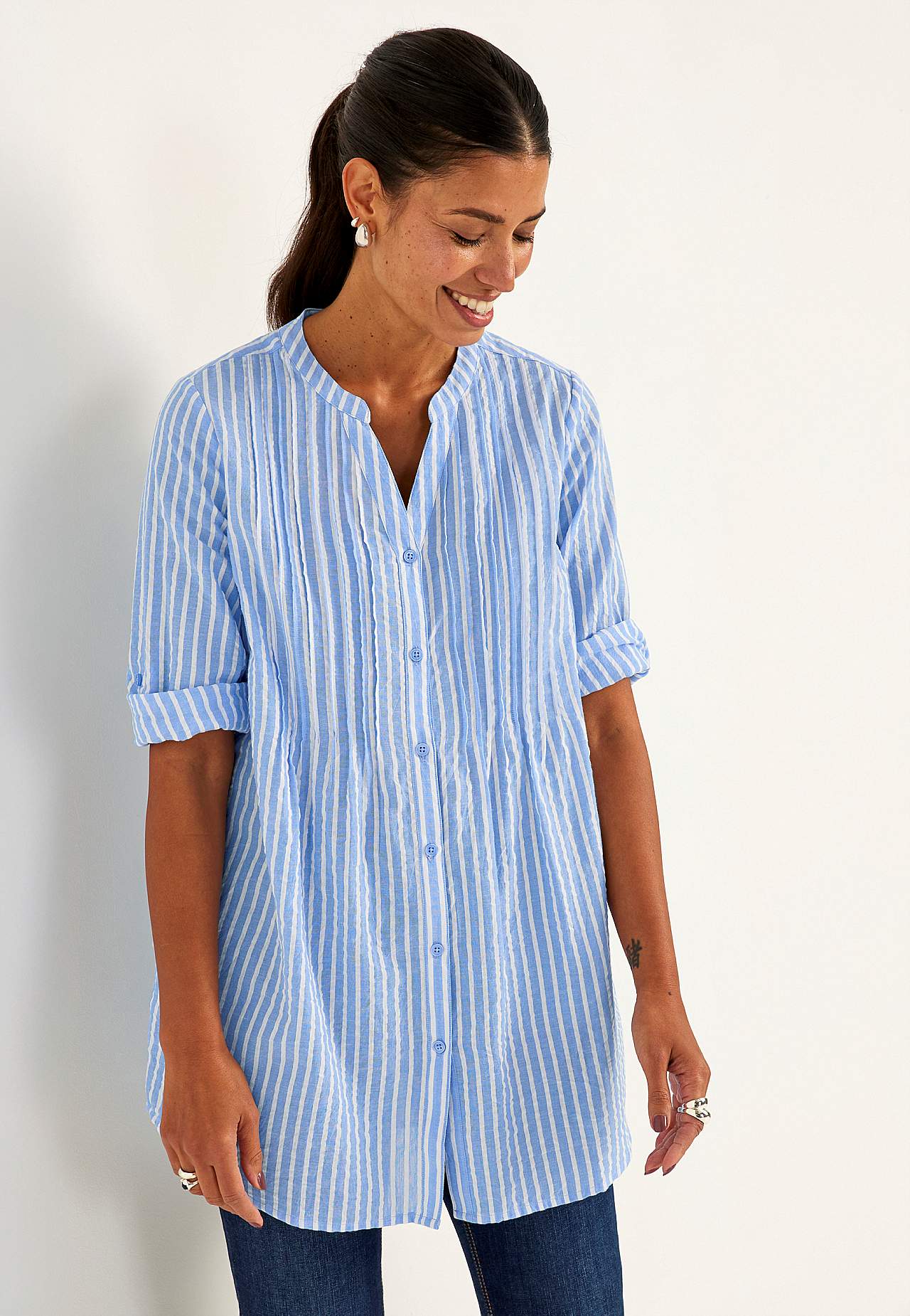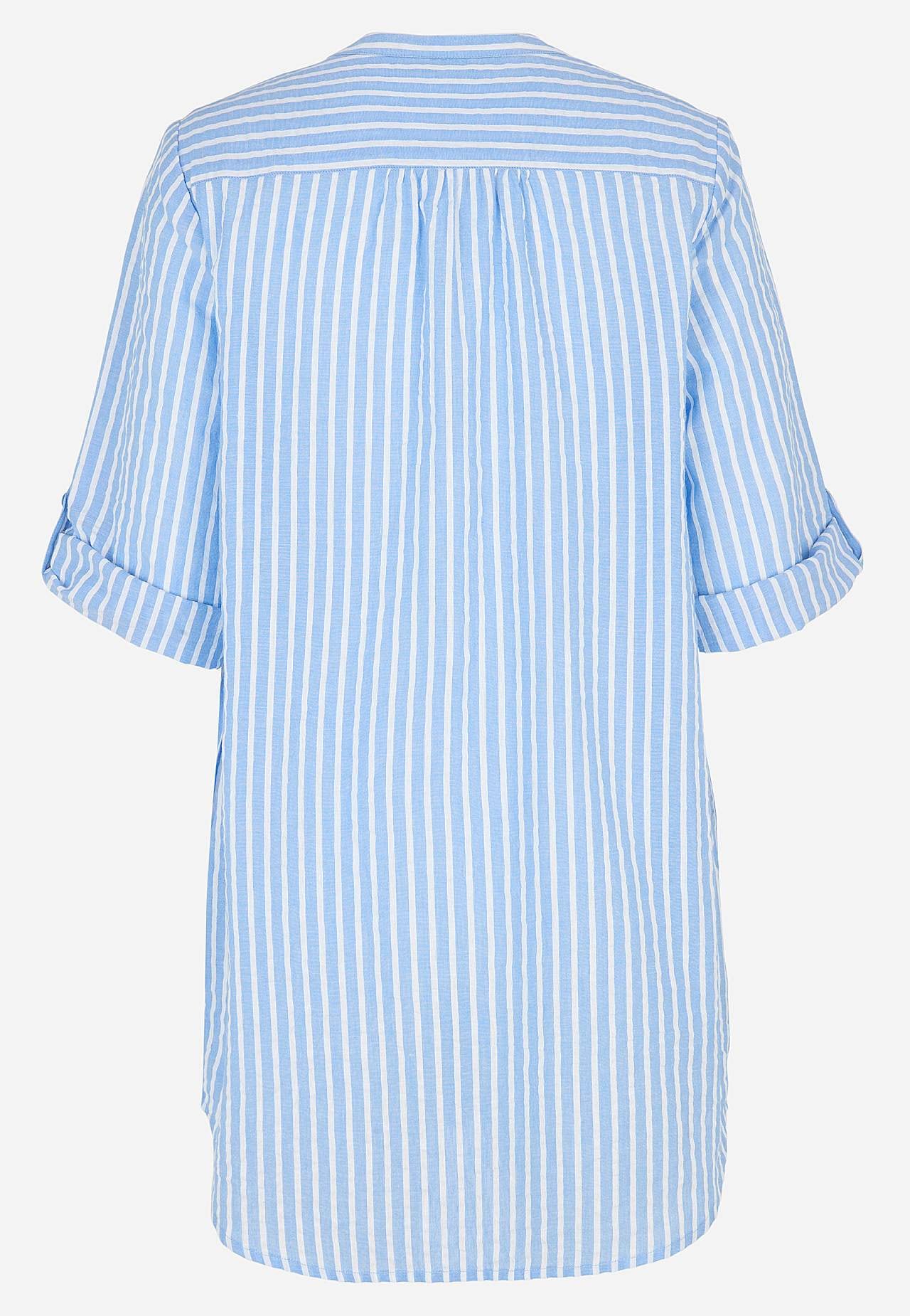 Gaisīgs garš krekls ar dekoratīvām nošuvēm. Skaists krokots materiāls. Apaļš kakla izgriezums ar V veida atvērumu. Pogu aizdare. Platas, uzlokāmas ¾ garuma piedurknes ar pogu. Sānos slēptas kabatas. Atdaļa un krokojums mugurpusē. Garums no pleca atbilstīgi izmēram apmēram 82-94 cm.