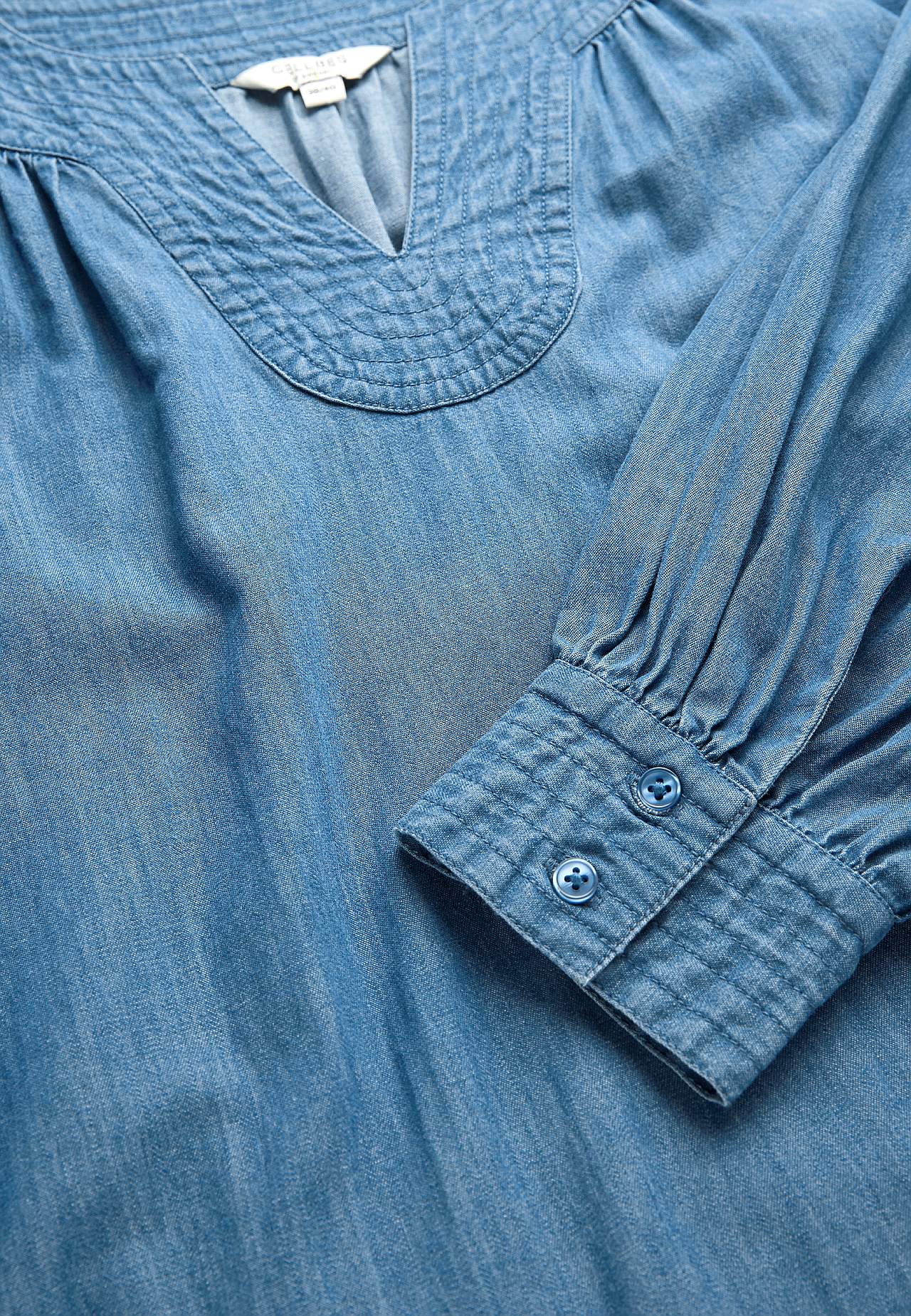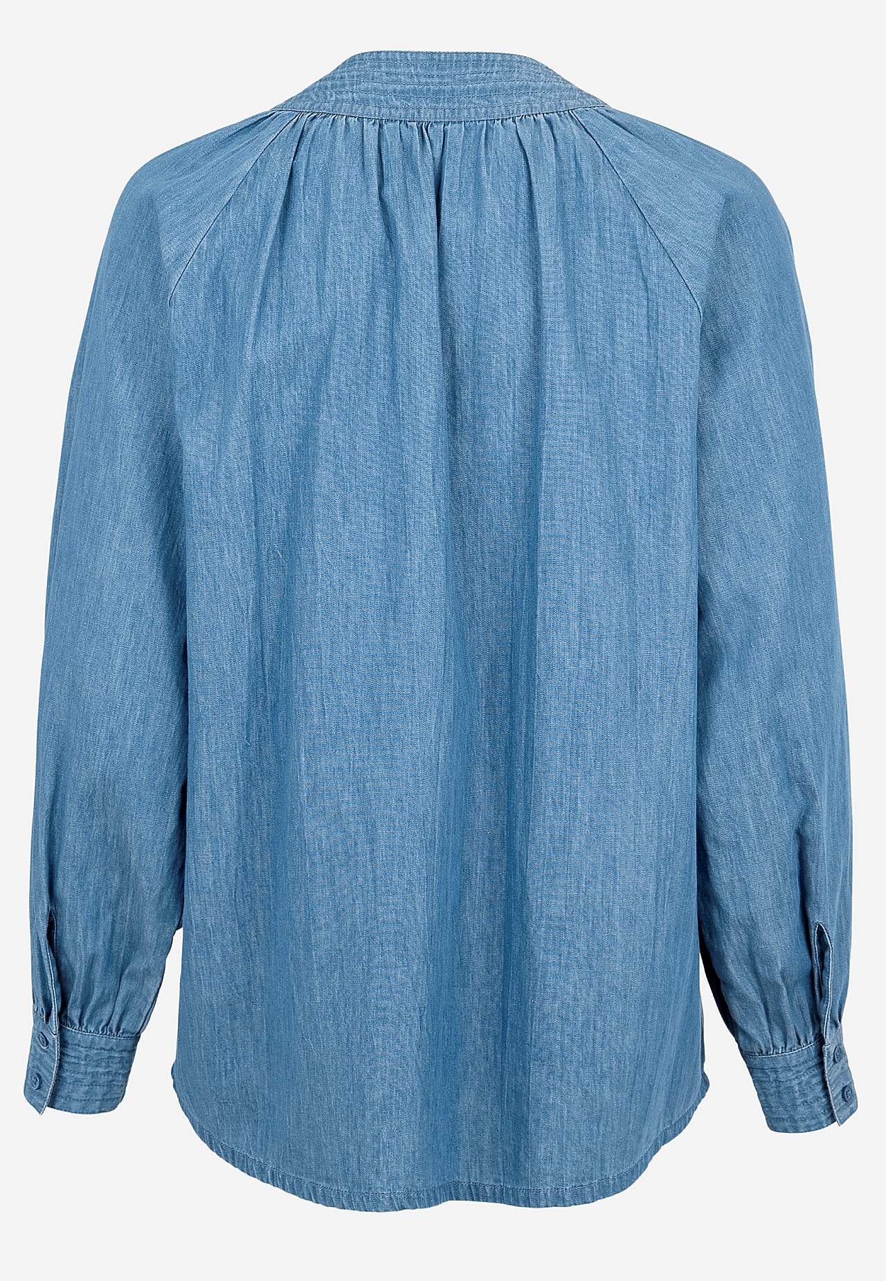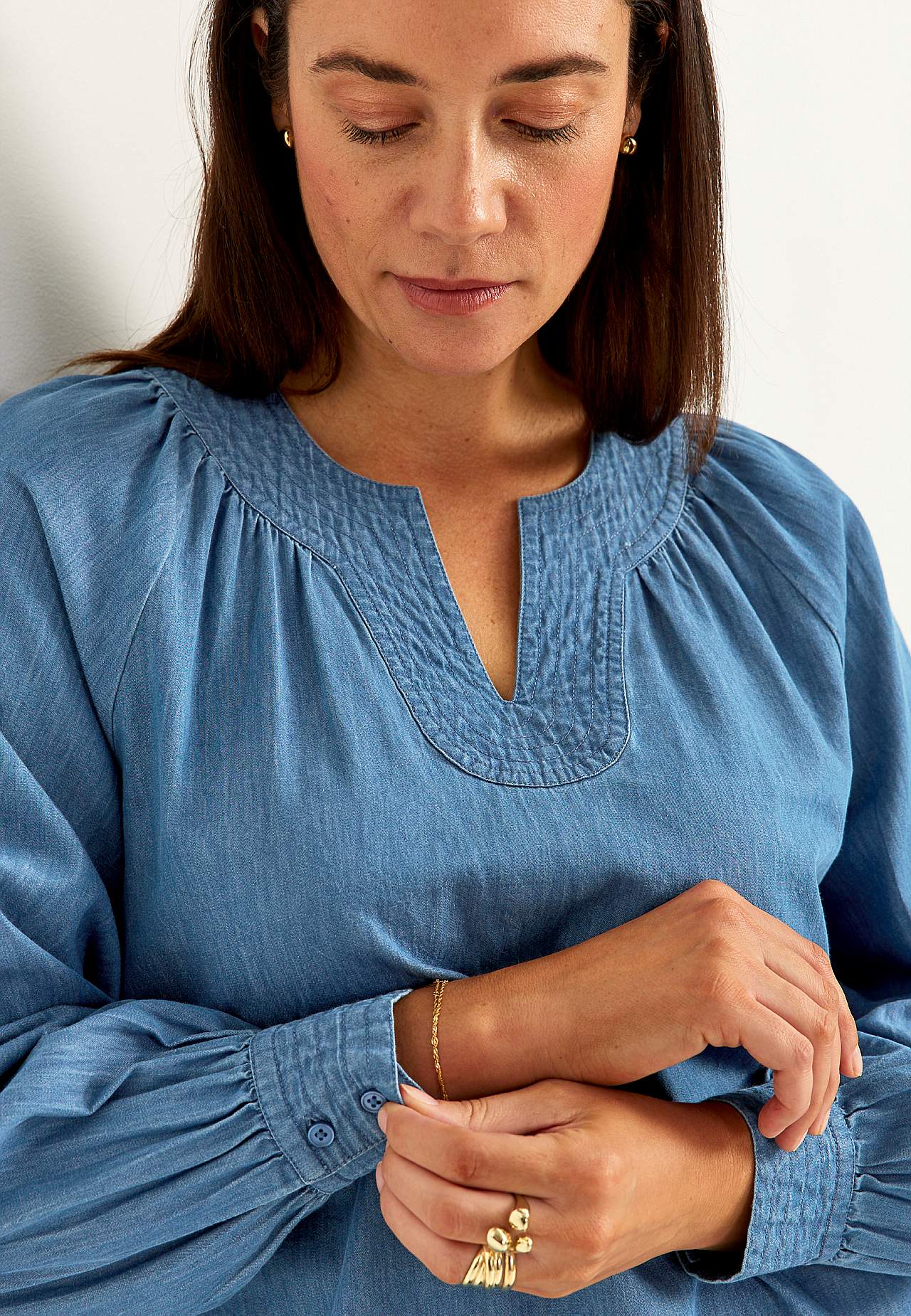 Viegla un brīnišķīgi mīksta džinsa auduma tunika. Dabisks kritums un gaisīgums. Brīvs viegla A silueta piegriezums. Apaļš kakla izgriezums ar V veida atvērumu un dekoratīvām nošuvēm visapkārt. Garas, platas reglāna piedurknes, aproces ar dekoratīvām nošuvēm un divām pogām. Noapaļota apakšmala, nedaudz garāka mugurpusē. Garu... Lasīt vairāk
