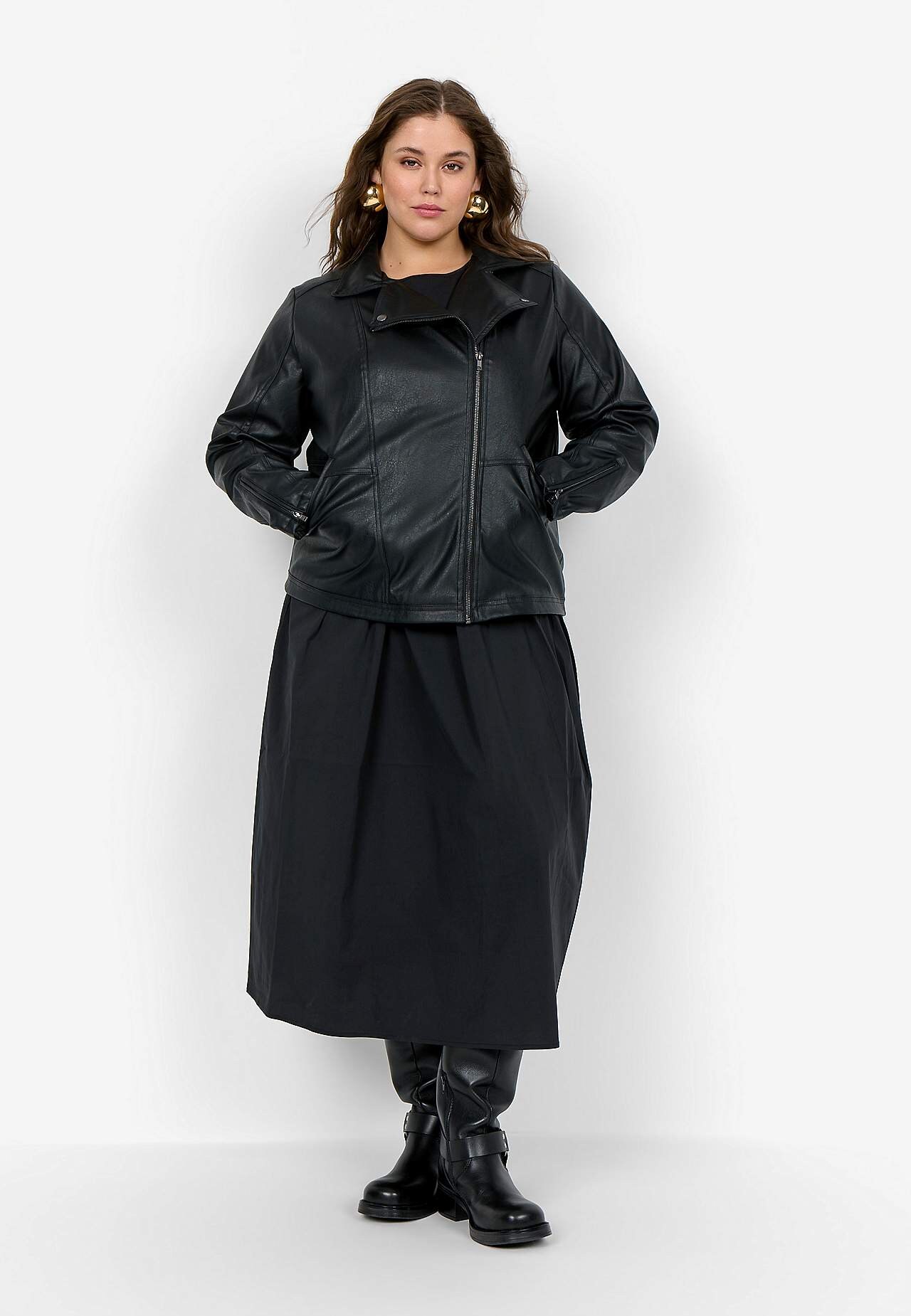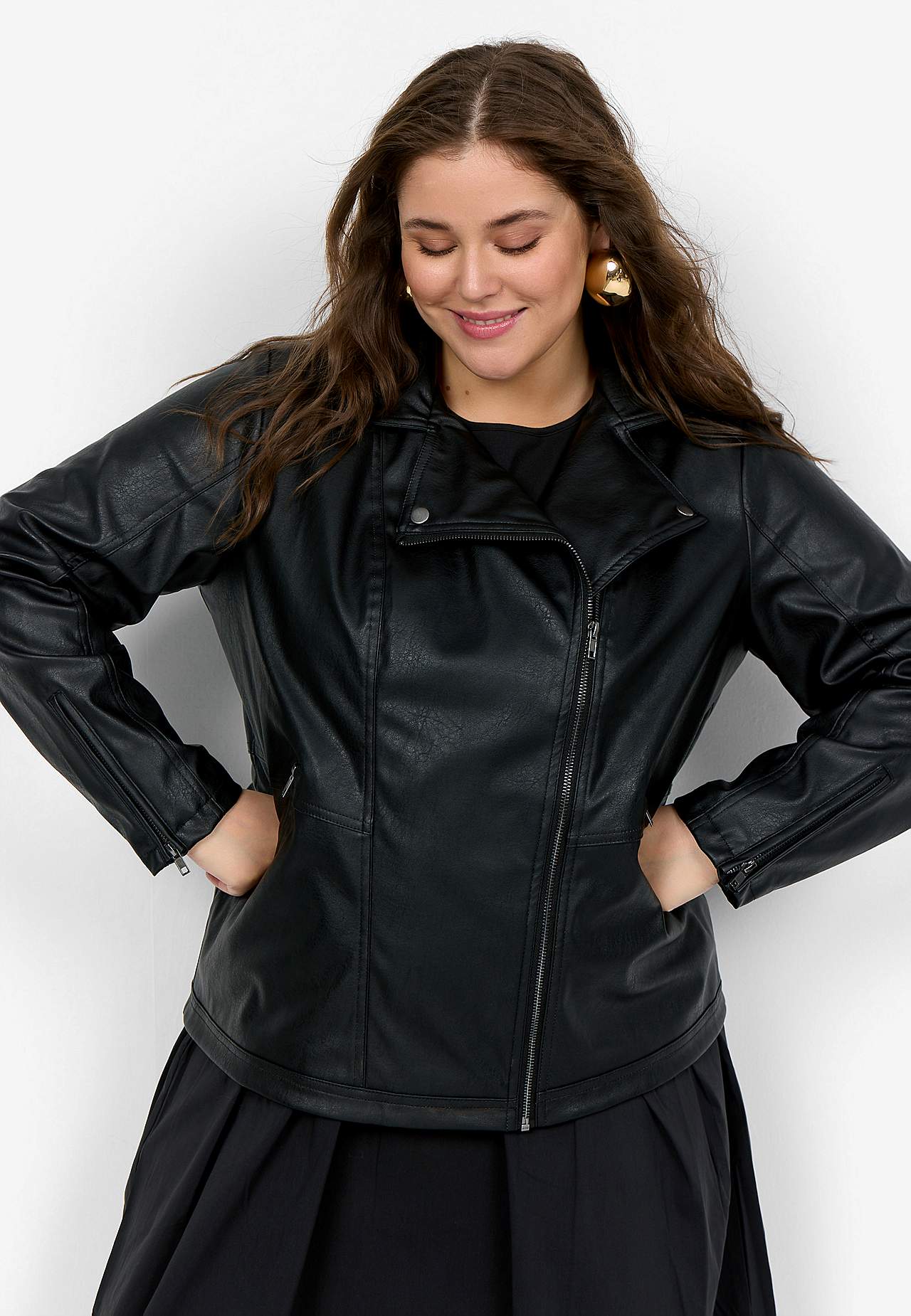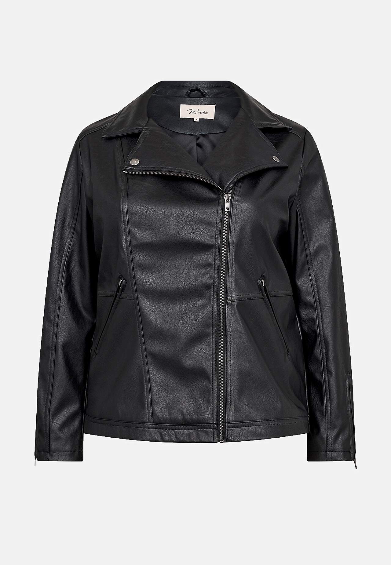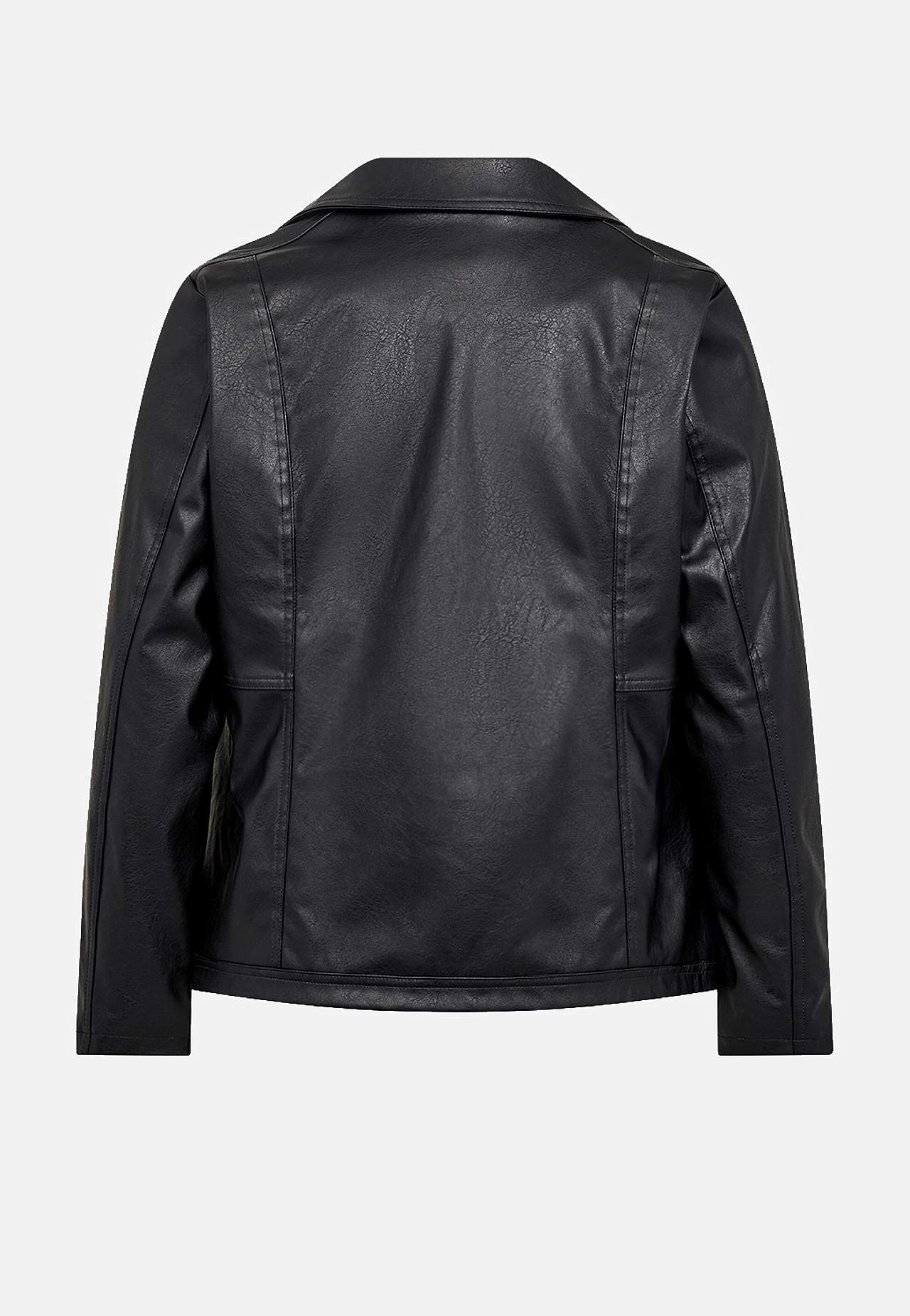 Mīksta mākslīgās ādas jaka. Klasisks dizains ar antīka sudraba krāsas rāvējslēdzējiem. Nedaudz pagarināts brīva piegriezuma modelis. Plāna satīna odere. Priekšpusē slīpas kabatas ar rāvējslēdzēju. Garums no pleca 46./48. (M) izmēram apmēram 69 cm.