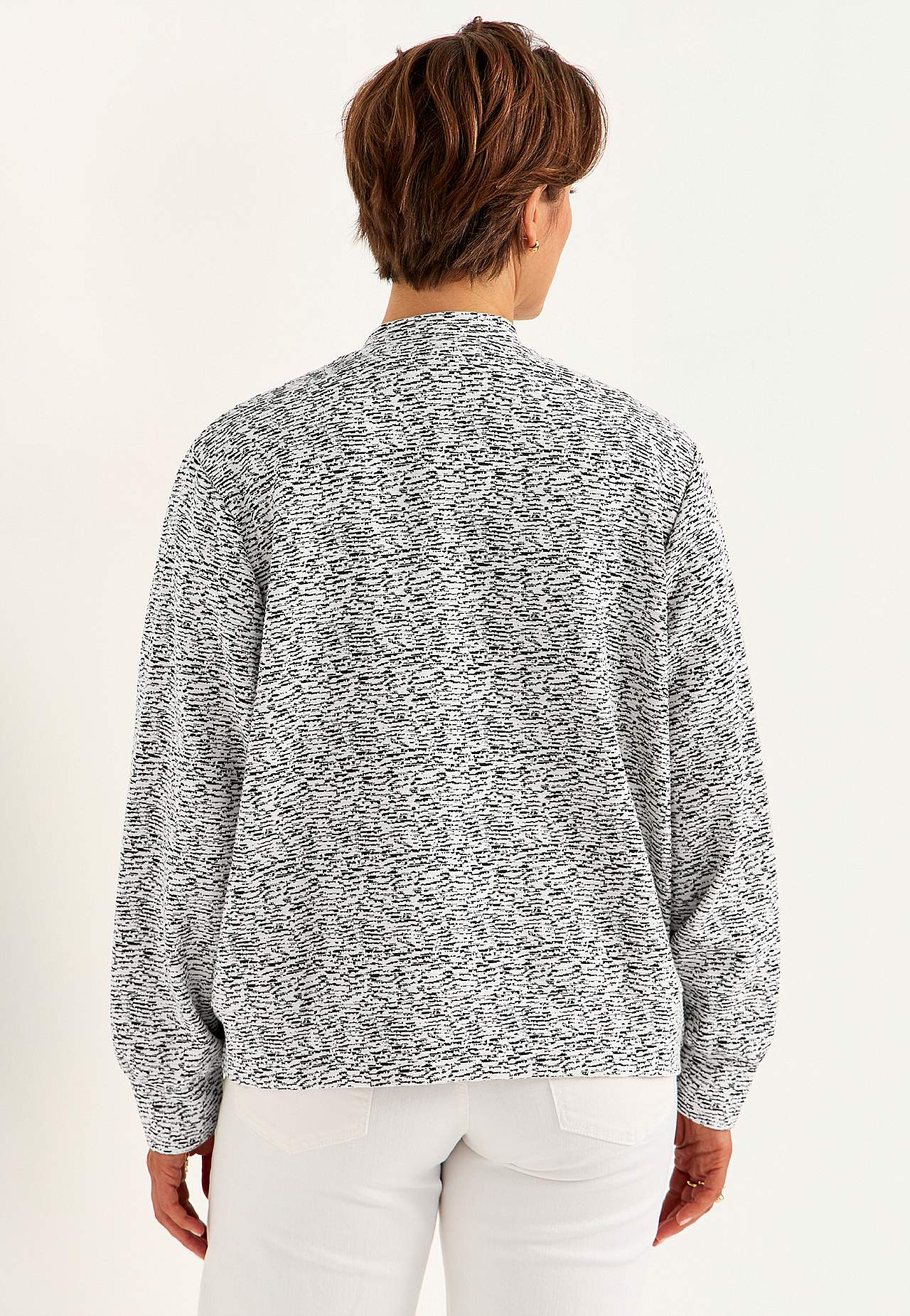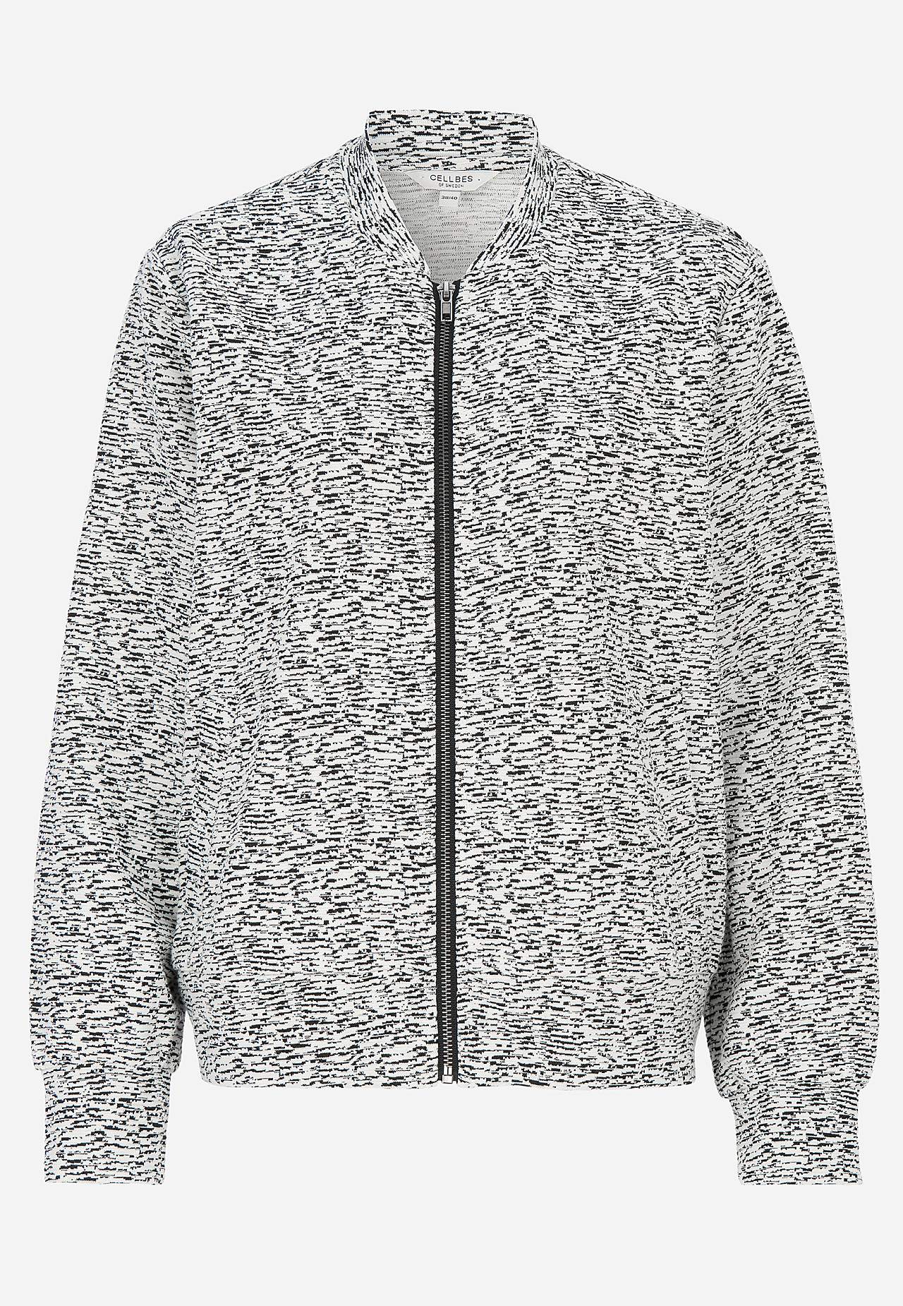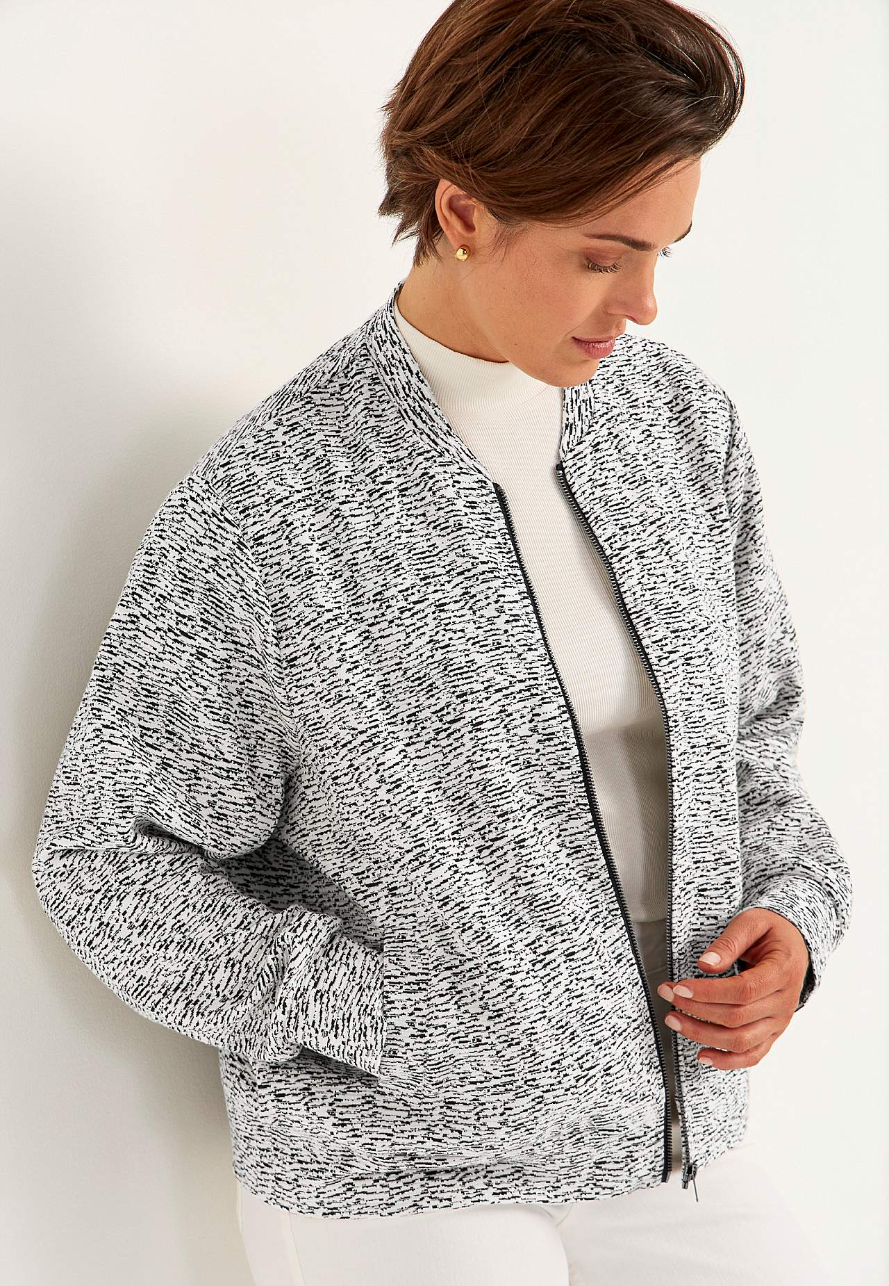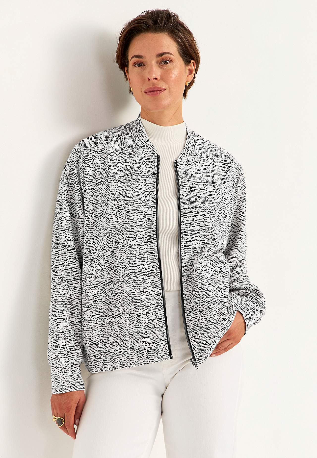 Mīksta pabiezas trikotāžas iekštelpu jaka ar svītru tekstūru. Brīvs piegriezums. Neliela stāvapkakle. Rāvējslēdzēja aizdare. Slīpas iešūtas kabatas. Garas piedurknes ar aproci galā. Taisna piegriezuma dubulta apakšmala. Garums no pleca atbilstīgi izmēram aptuveni 72-84 cm.