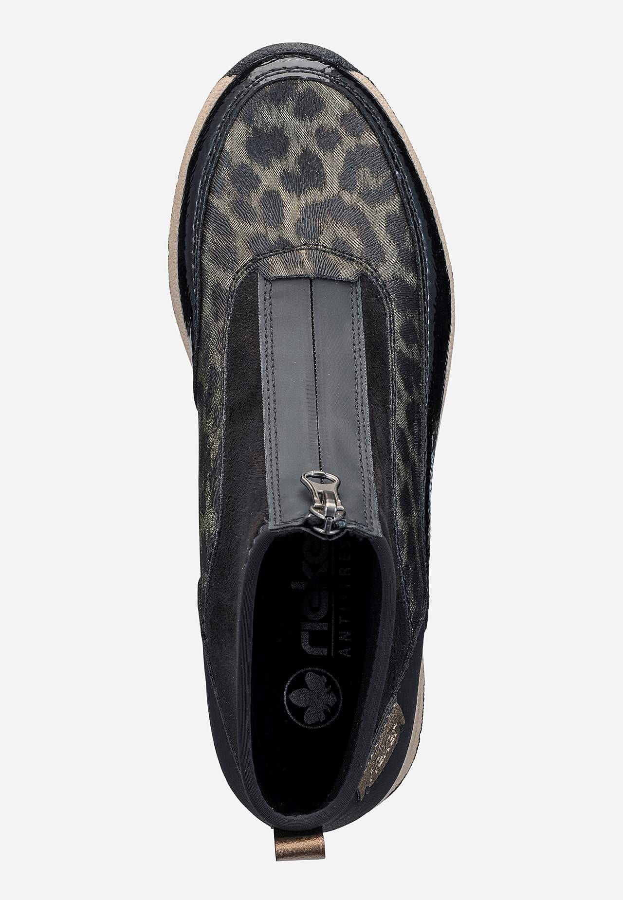 Teniskurpes ar nedaudz pagarinātu stulmu. Melnas/zelta krāsas leopardādas raksts un lakotas detaļas. Elastīga virspuse. Slēpts rāvējslēdzējs pēdas virspusē. Viegli polsterēta iekšpuse. Izņemama, polsterēta iekšzolīte. Triecienu absorbējoša zole. Logo ārmalā. Rieker “Antistress”: skatiet turpinājumā. Tekstila un sintētiska m... Lasīt vairāk