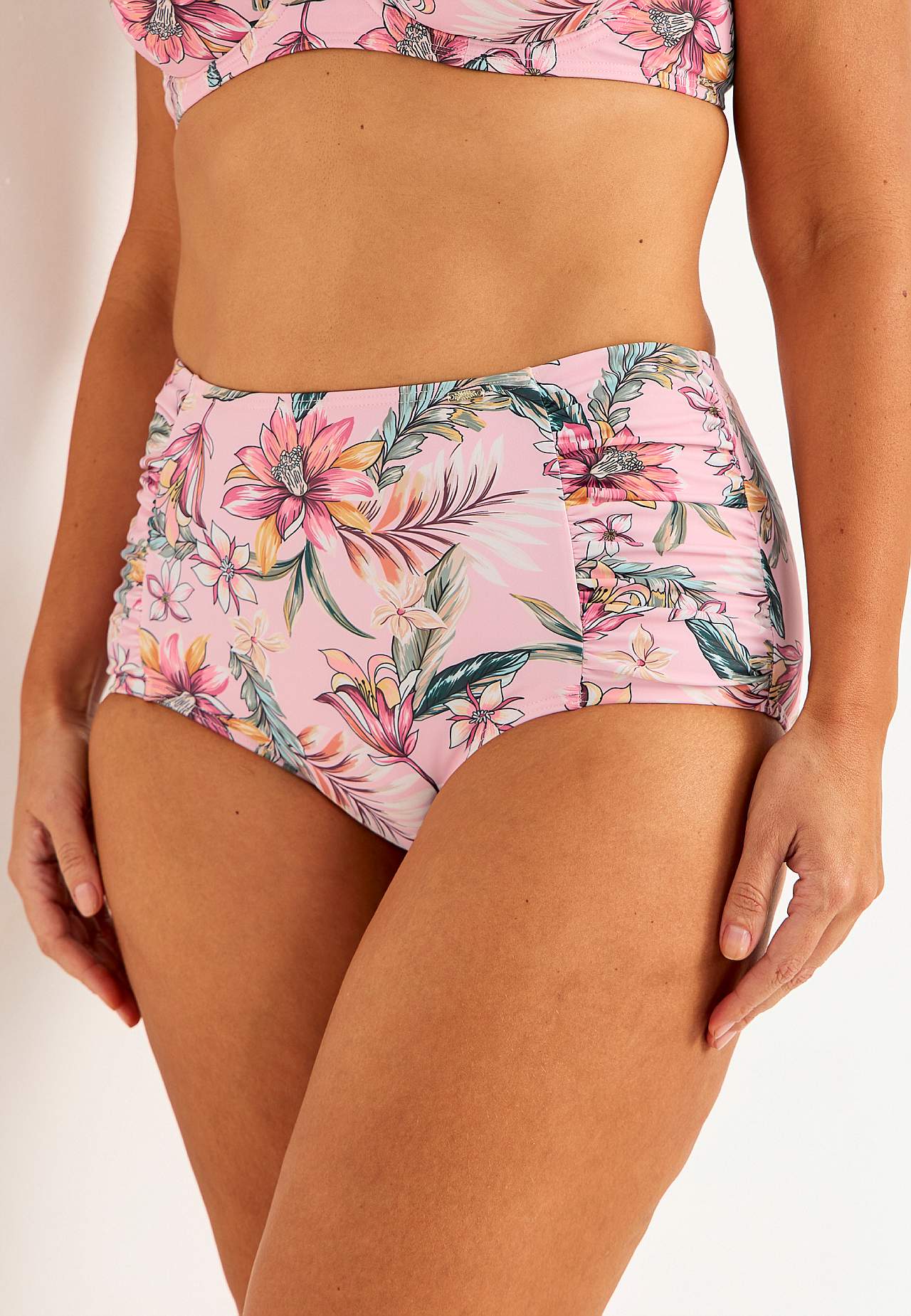 Puķainas bikini biksītes no pārstrādāta poliestera. Augsta jostasvieta. Dekoratīvs krokojums sānos. Pilnībā oderēta iekšpuse.